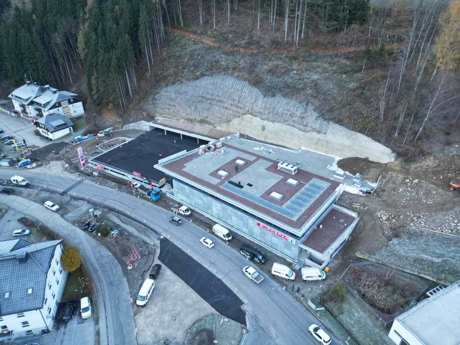 Neubau Eurospar Gmünd / Kärnten. Auftraggeber: Spar Österreichische Warenhandels AG. Ausführung von 2.200 m² Gründach und 700 m² Parkdeck samt Spenglerarbeiten. Bauzeit: 2025.